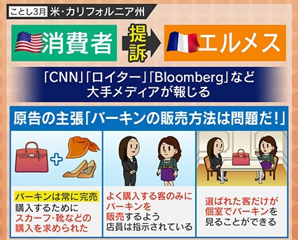 そのバーキンをめぐって衝撃報道が走りました。今年3月、米・カリフォルニア州でアメリカの消費者がフランスのエルメスを提訴したと「CNN」「ロイター」「Bloomberg」などの大手メディアが続々と報じました。原告の主張は、「バーキンの販売方法は問題だ!」ということで、その問題点を「バーキンは常に完売しているので、購入するためにスカーフや靴などほかの商品の購入を求められた」さらに「よく購入する客のみにバーキンを販売するよう店員は指示されている」ほかにも「選ばれた客だけが個室でバーキンを見ることができる」としています。