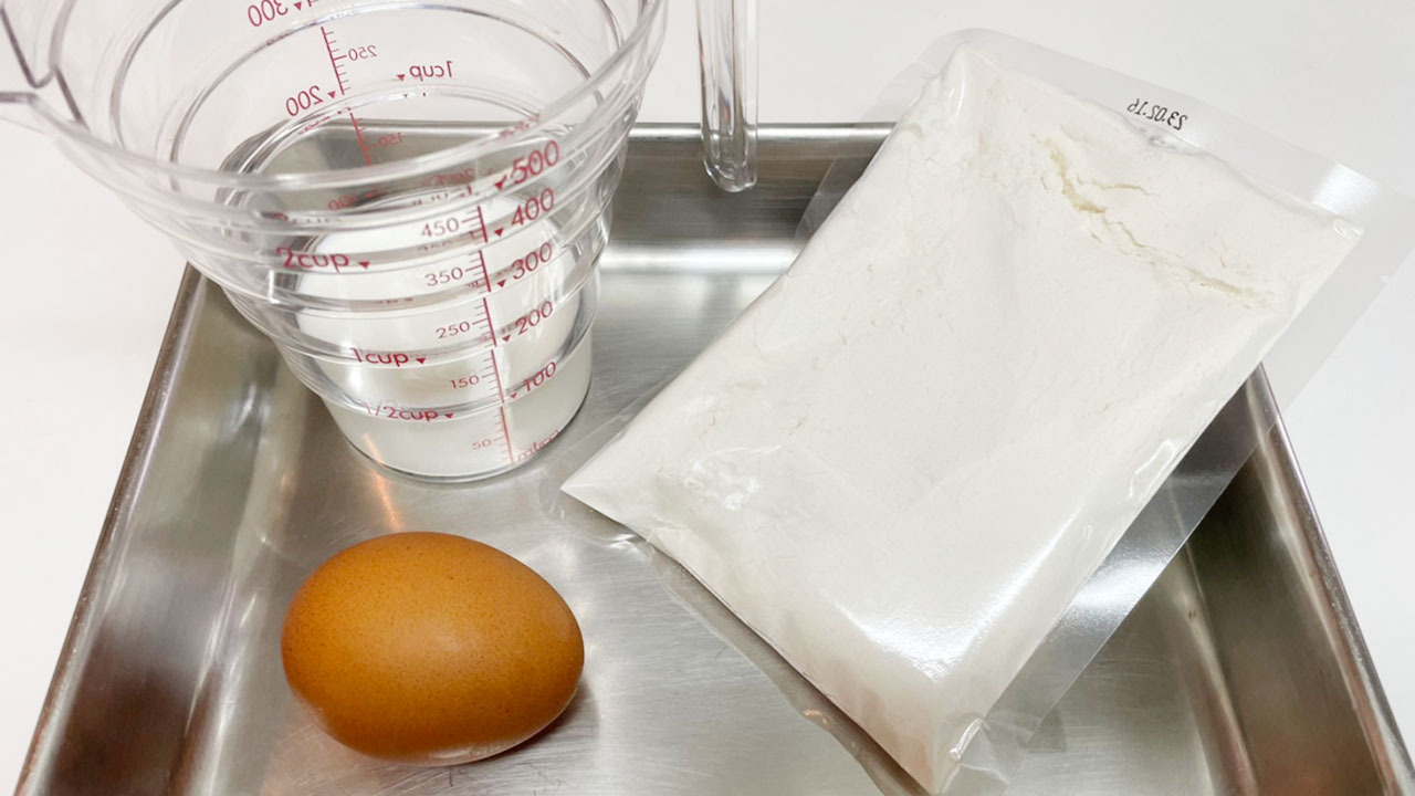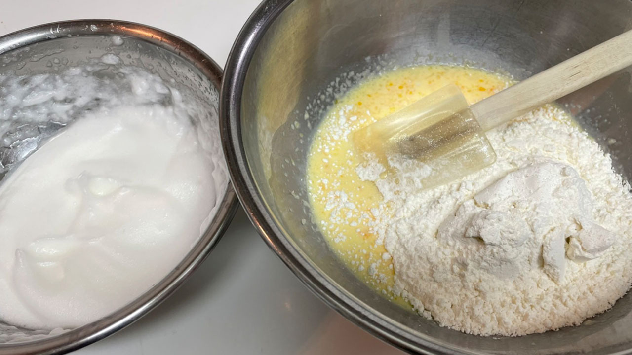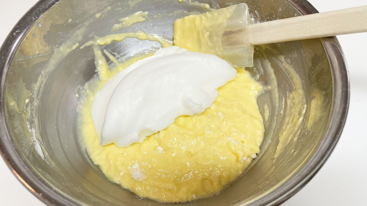① 卵を卵黄と卵白に分け、卵白はハンドミキサーで角が立つくらいのメレンゲにする。