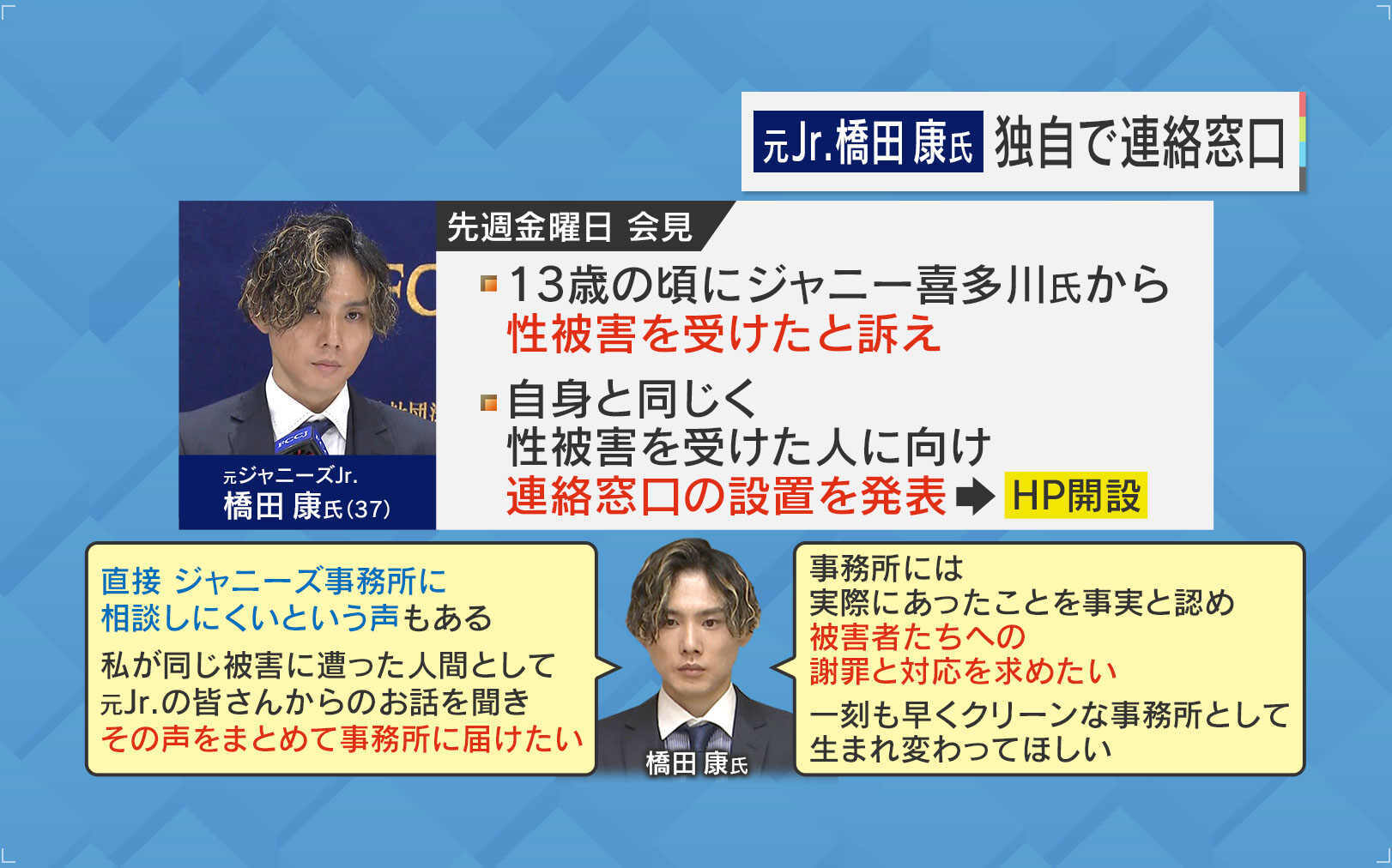 さらに、元ジャニーズJr.の橋田康氏も独自で「相談窓口」の設置を発表しています。橋田氏は、「直接ジャニーズ事務所に相談しにくいという声もある。私が同じ被害にあった人間としてその声をまとめて事務所に届けたい。事務所には実際にあったことを事実と認め、被害者たちへの謝罪と対応を求めたい」としています。