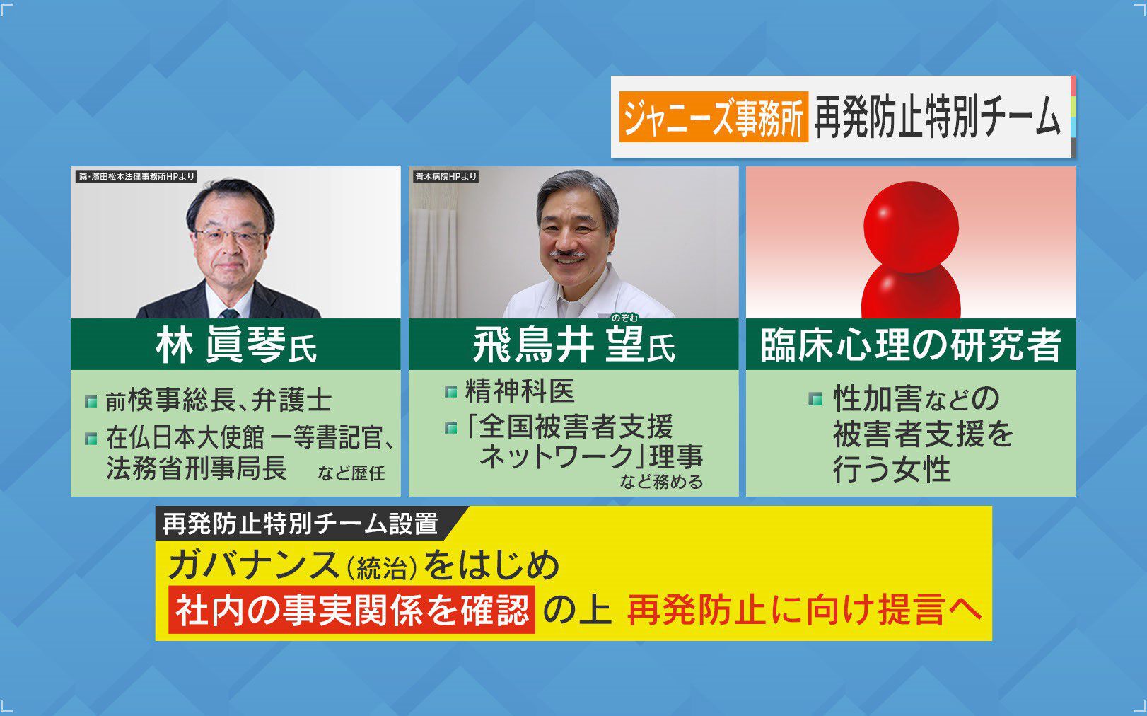その再発防止特別チームは、前検事総長の林眞琴氏をトップに据え、精神科医で全国被害者支援ネットワーク理事などを務める飛鳥井望氏などが就任しています。ガバナンスをはじめ社内の事実関係を確認の上再発防止に向け提言していくとしています。