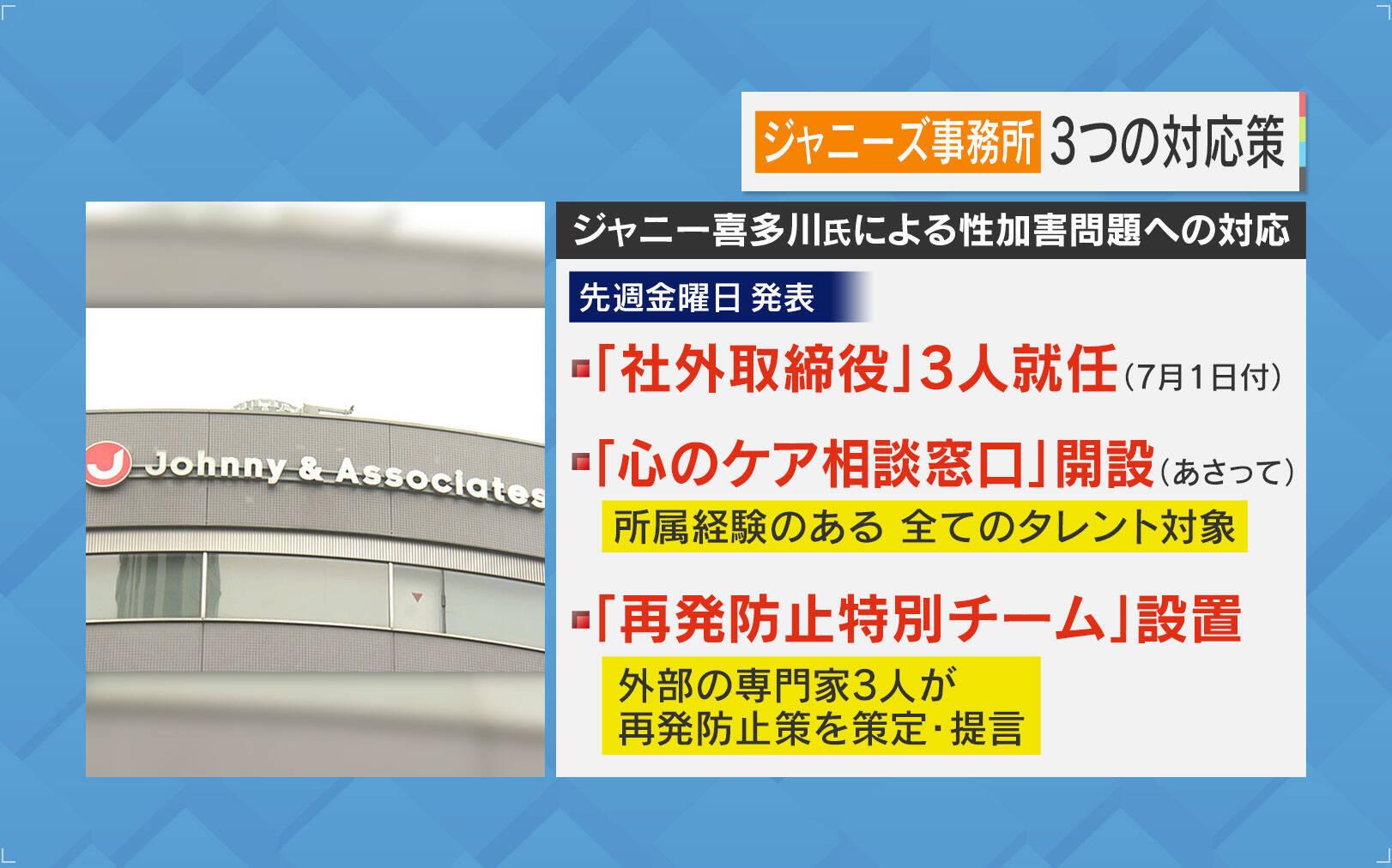 ジャニーズ事務所が発表したという3つの対応策ですが、1つ目が社外取締役3人の就任。2つ目が「相談窓口」の設置。3つ目が再発防止特別チームの設置です。その3人の社外取締役には、元環境事務次官の中井徳太郎氏、日弁連の元常務理事の藤井麻莉氏、日本ハムファイターズや侍ジャパンのヘッドコーチの白井幸一氏が就任するとのことです。