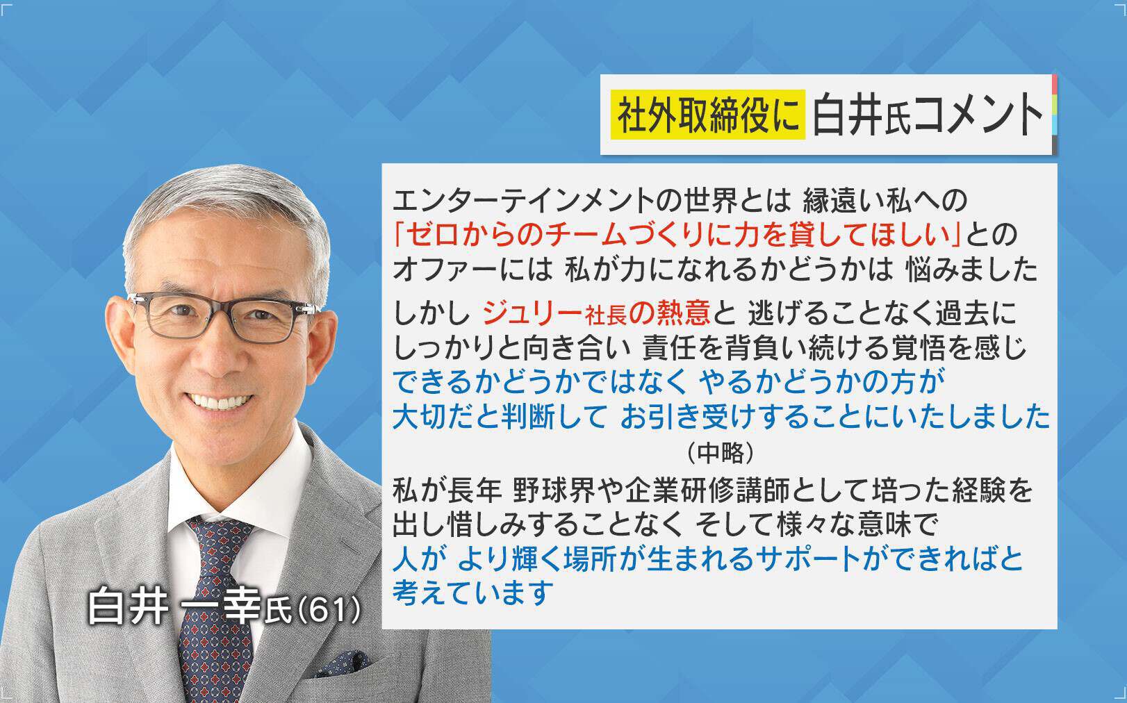 白井氏は、今回の社外取締役就任について、「エンタテインメントの世界とは縁遠い私への『ゼロからのチームづくりに力を貸してほしい』とのオファーには、私が力になれるかどうかは悩みました。しかしジュリー社長の熱意と、逃げることなく過去にしっかりと向き合い、責任を背負い続ける覚悟を感じ、できるかどうかではなく、やるかどうかの方が大切だと判断してお引き受けすることにいたしました。私が長年野球界や企業研修講師として培った経験を出し惜しみすることなく、そしてさまざまな意味で、人がより輝く場所が生まれるサポートができればと考えています」 と話しています。