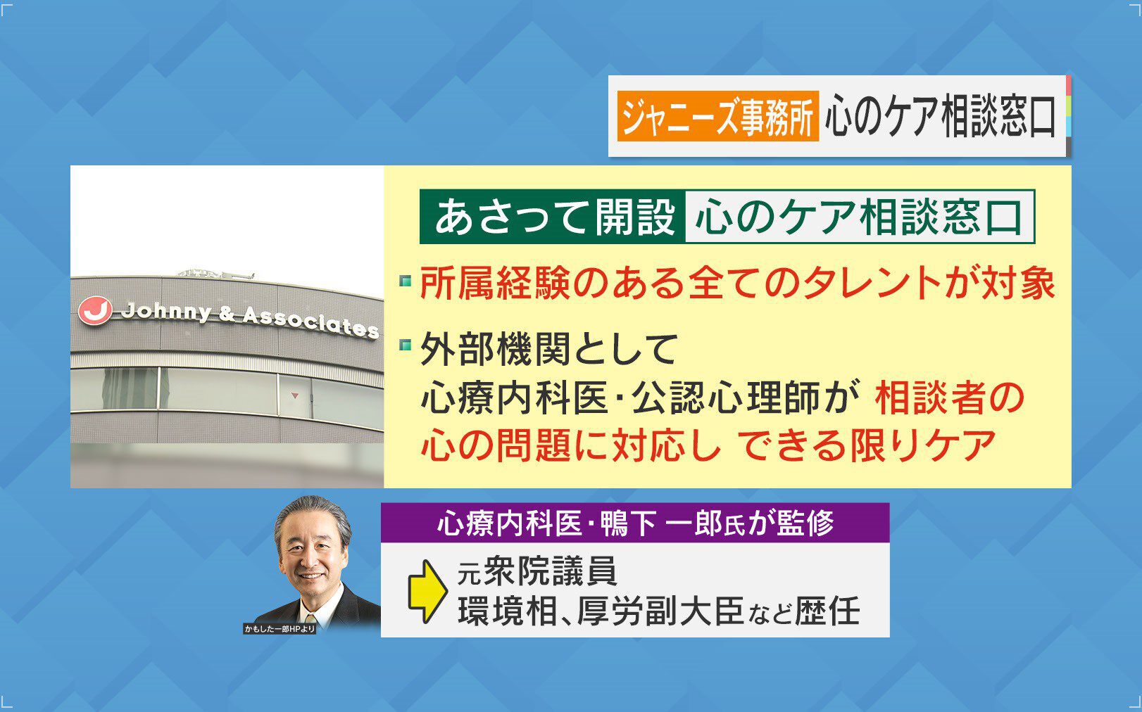 2つ目の「心のケア相談窓口」は所属経験のあるすべてのタレントが対象ということです。外部機関として、心療内科医・公認心理士が相談者の心の問題に対応し、できる限りケアするとのことで、元衆議院議員で環境大臣などを歴任した心療内科医の鴨下一郎氏が監修しているということです。