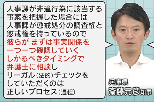 県・人事課の内部調査に問題はなかったかについて、斎藤知事は、「人事課が非違行為に該当する事案を把握した場合には、あくまで人事課が懲戒処分の調査権と懲戒権を持っているので、彼らがまずは事実関係を一つ一つ確認していく。然るべきタイミングで弁護士に相談、リーガルチェックをしていただくのは正しいプロセス」としています。