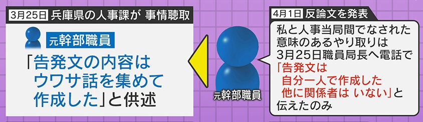 そして新たな火種として、事情聴取の食い違いがでてきています。3月25日の県・人事課の 事情聴取で、「元幹部職員は『告発文の内容はウワサ話を集めて作成した』と供述した」としていましたが、4月1日、元幹部職員は「私と人事当局間でなされた意味のあるやり取りは、3月25日、職員局長へ電話で『告発文は自分一人で作成した。他に関係者はいない』と伝えたのみ」と反論しています。