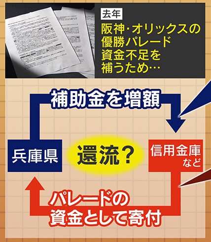 2023年の阪神・オリックスの優勝パレードの資金不足を補うために、兵庫県が信用金庫などに補助金を増額し、その見返りにパレードの資金として寄付を受け取ったのではないかという「還流疑惑」が出ています。