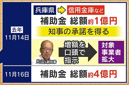 2023年11月14日、兵庫県から信用金庫などへの補助金が総額約1億円ということで知事の承諾を得たのですが、前年と比べて減額しているので増やそうという話になり、片山元副知事が“口頭”で指示し、2日後の16日には総額約4億円に増額されたということです。