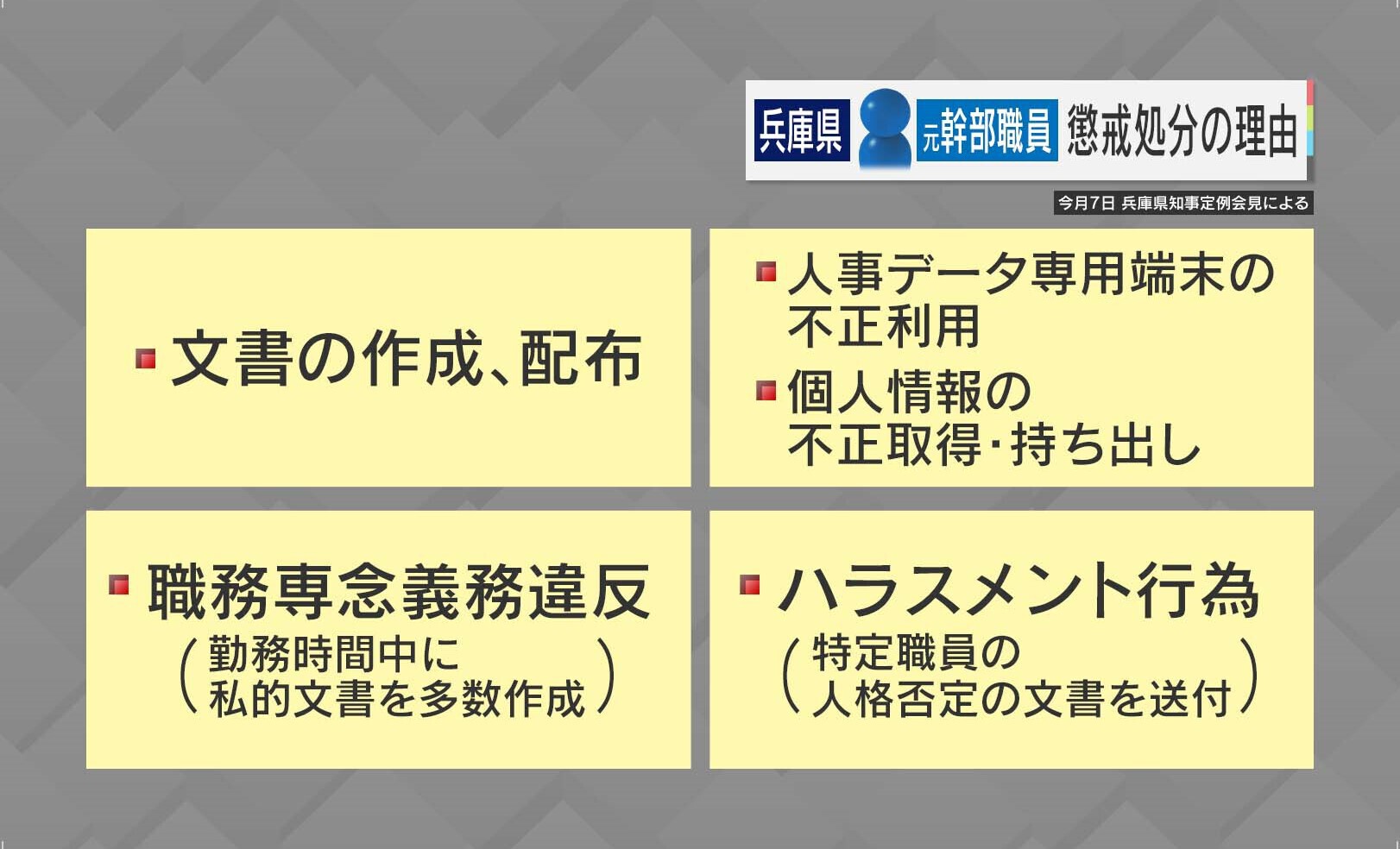 県は元幹部職員に対しての懲戒処分の理由として、「外部への文章、配布があった」、「人事データ専用端末の不正利用」、「個人情報の不正取得・持ち出し」、「勤務時間中に私的文章を多数作成した職務専念義務違反」、「特定職員の人格否定の文章を送付したハラスメント行為」などを挙げています。