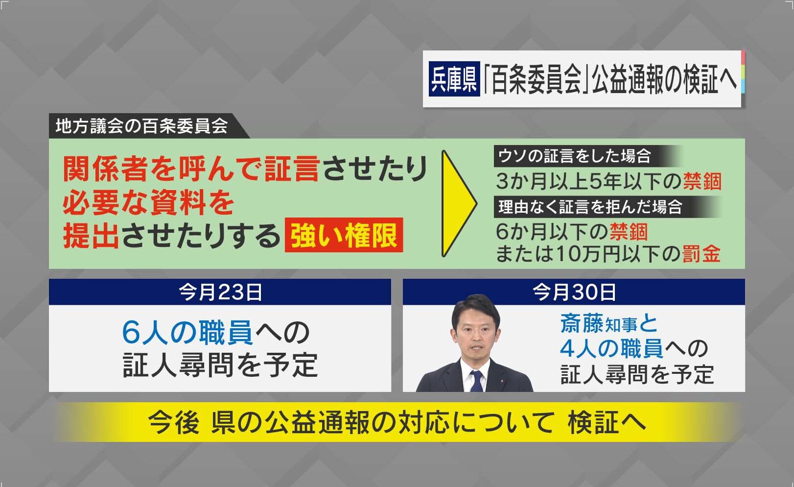 兵庫県・斎藤知事の“パワハラ疑惑”に関して、百条委員会は、県の公益通報の対応について検証を行う方針です。この百条委員会は関係者を呼んで証言させたり、必要な資料を提出させたりする強い権限を持っていて、ウソの証言をした場合は、3か月以上5年以下の禁錮、理由なく証言を拒否した場合は6か月以下の禁錮または10万円以下の罰金が科せられます。8月23日には県職員、30日には斎藤知事などへの証人尋問が予定されています。