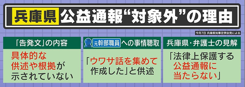 なぜ「公益通報」保護の“対象外”になったのでしょうか?8月7日に開かれた会見では、「告発文」の内容について、①「具体的な供述や根拠が示されていない」、②元幹部職員への事情聴取で「ウワサ話を集めて作成した」と供述があった、③県の弁護士の見解で「法律上保護する公益通報に当たらない」、からだとしています。
