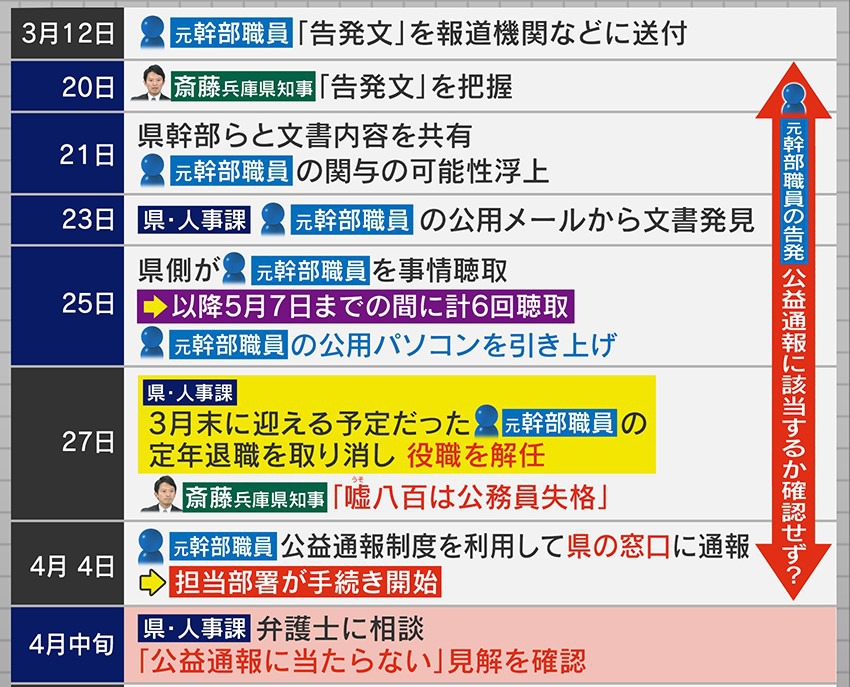 今後この「公益通報」が大きなポイントとなりますが、時系列で整理しますと、2024年3月12日、元幹部職員は『告発文』を報道機関などに送付しました。そして3月20日には知事は「告発文」を把握していたということです。翌21日、県の職員らと文章の内容を共有し、元幹部職員の関与の可能性が浮上しています。さらに23日、県の人事課が元幹部職員の公用メールから文章の骨子となる内容を発見しています。