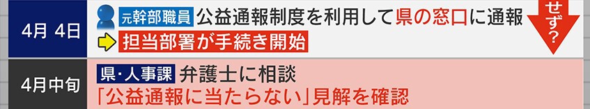 4月4日、元幹部職員は公益通報制度を利用して、県の窓口に内部通報を行い、担当部署が手続きを開始しました。4月中旬に県・人事課はここで初めて弁護士に相談をし、「公益通報に当たらない」との見解を確認できたということです。つまり、4月中旬まで公益通報に当たるか当たらないかを確認していなかったのではないか、との指摘を受けています。