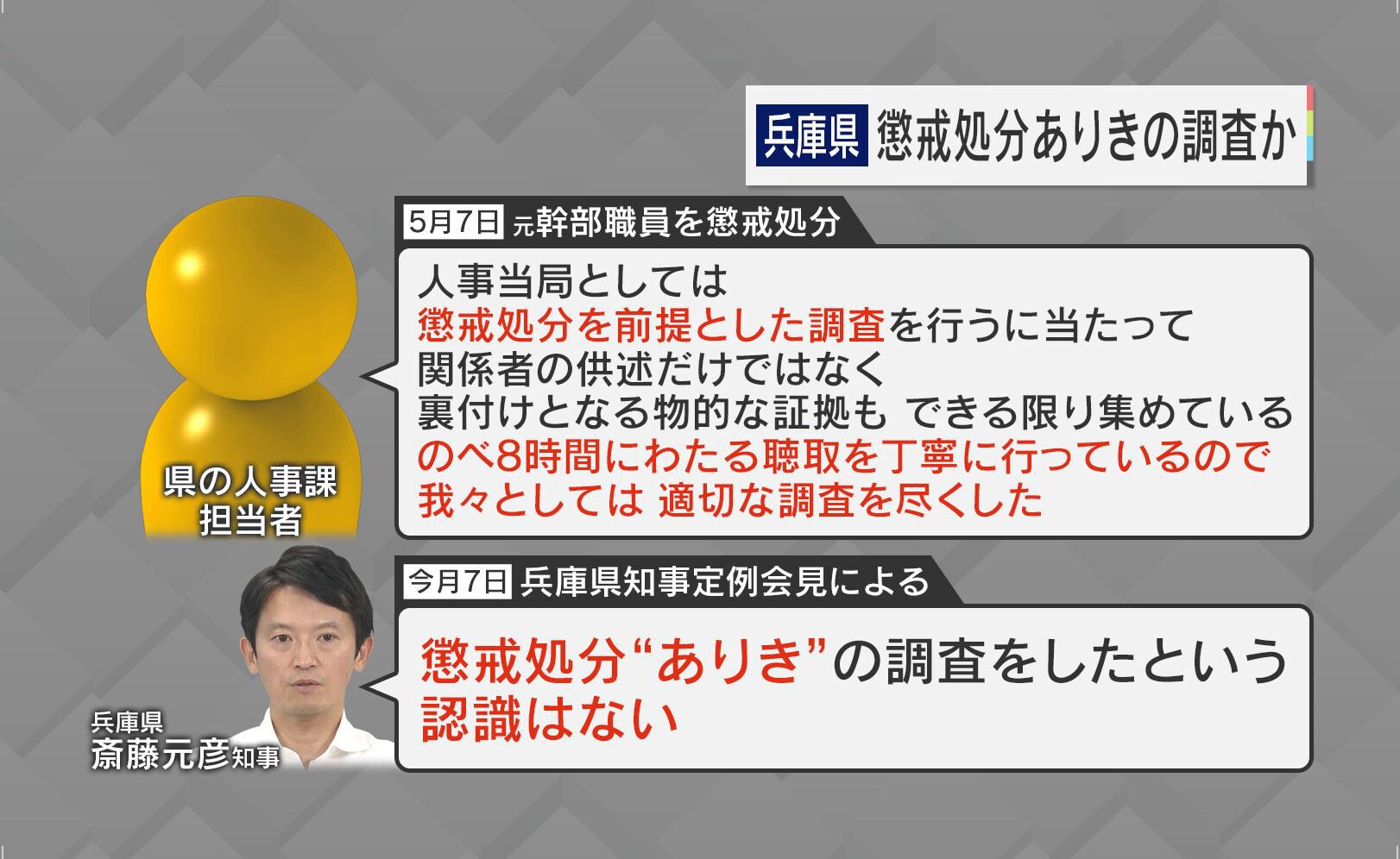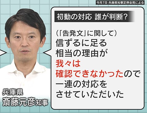 元幹部職員が停職3か月の懲戒処分を受けたことについて、懲戒権を持つ県・人事課の担当者は「人事当局としては、懲戒処分を前提とした調査を行うにあたって、関係者の供述だけではなく裏付けとなる物的な証拠もできる限り集めている。のべ8時間にわたる聴取を丁寧に行っているので、我々としては適切な調査を尽くした」と説明しています。8月7日、斎藤知事は「懲戒処分“ありき”の調査をしたという認識はない」と答えています。