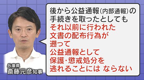 また、斎藤知事は「後から(県の)公益通報の手続きを取ったとしても、それ以前に行われた文章の配布行為が遡って公益通報として保護されることにならない。懲戒処分も逃れられない」としています。