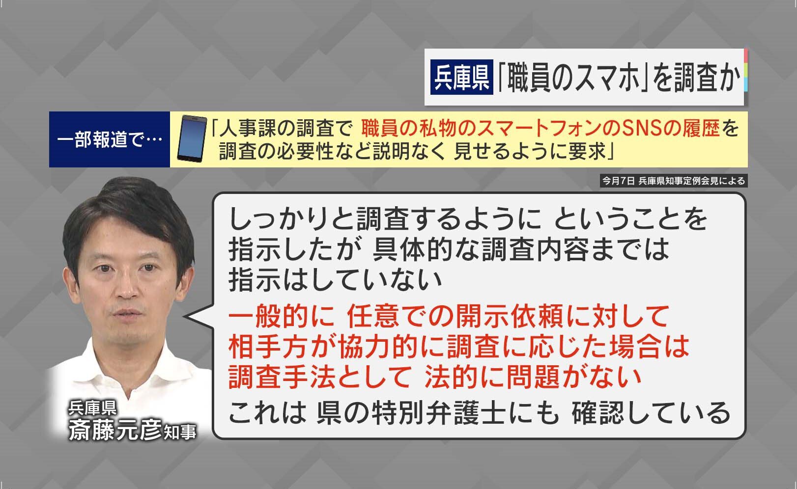 一部報道で、「人事課の調査で、職員の私物のスマートフォンのSNSの履歴を調査の必要性など説明なく見せるように要求」とありました。これに対して斎藤知事は「しっかりと調査するようにということを指示したが、具体的な調査内容までは指示はしていない。一般的に、任意での開示依頼に対して、相手方が協力的に調査に応じた場合は、調査手法として法的に問題がない。これは県の特別弁護士にも確認している」と発言しています。