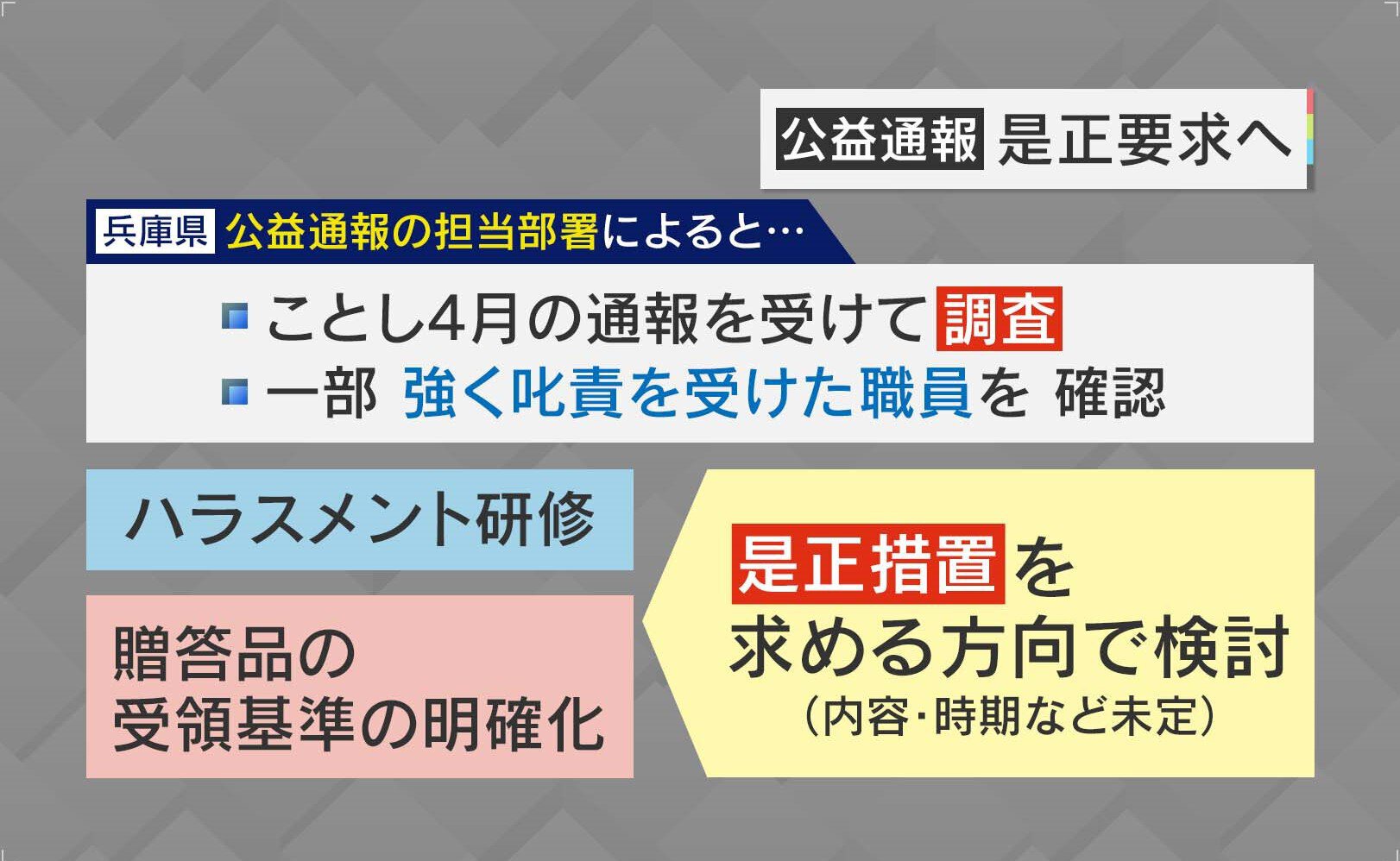 県の公益通報の担当部署によると、2024年4月の通報を受けて調査をし、一部強く叱責を受けた職員を確認した。ハラスメント研修や贈答品の受領基準の明確化など是正措置を求める方向で検討していくということです。