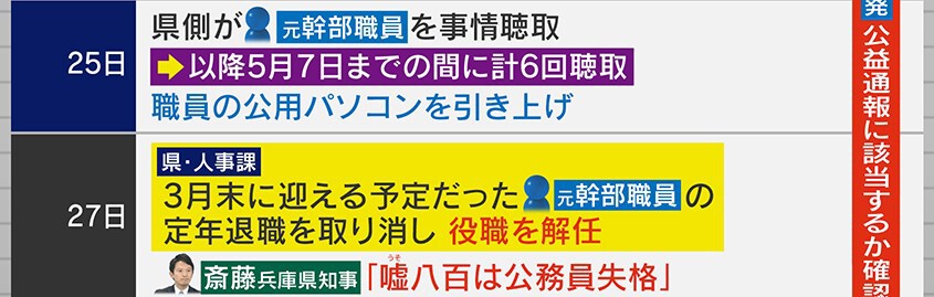 そして、25日には県側が元幹部職員を事情聴取し、以降5月7日までの間に計6回聴取が行われたといいます。また、25日に県は元幹部職員の公用パソコンを引き上げています。そして3月27日、県の人事課は3月末に迎える予定だった元幹部職員の定年退職を取り消し、役職を解任しています。同じ日に斎藤知事は「嘘八百は公務員失格」などと強い発言をしています。