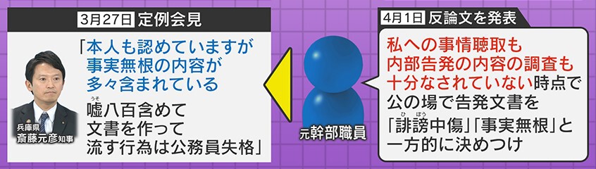 また、3月27日、定例会見での斎藤知事の「本人も認めていますが、事実無根の内容が多々含まれている。嘘八百含めて文章を作って流す行為は公務員失格」という発言に対して、元幹部職員は「私への事情聴取も内部告発の内容の調査も十分なされていない時点で、公の場で告発文章を『誹謗中傷』『事実無根』と一方的にきめつけている」としています。