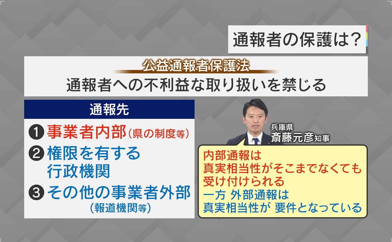 「公益通報者保護法」では、通報先を①事業者内部、②権限を有する行政機関、③その他の事業者内部(報道機関等)となっています。斎藤知事は「内部通報は、真実相当性がそこまでなくても受け付けられる。一方外部通報は、真実相当性が要件となっている」と話しています。