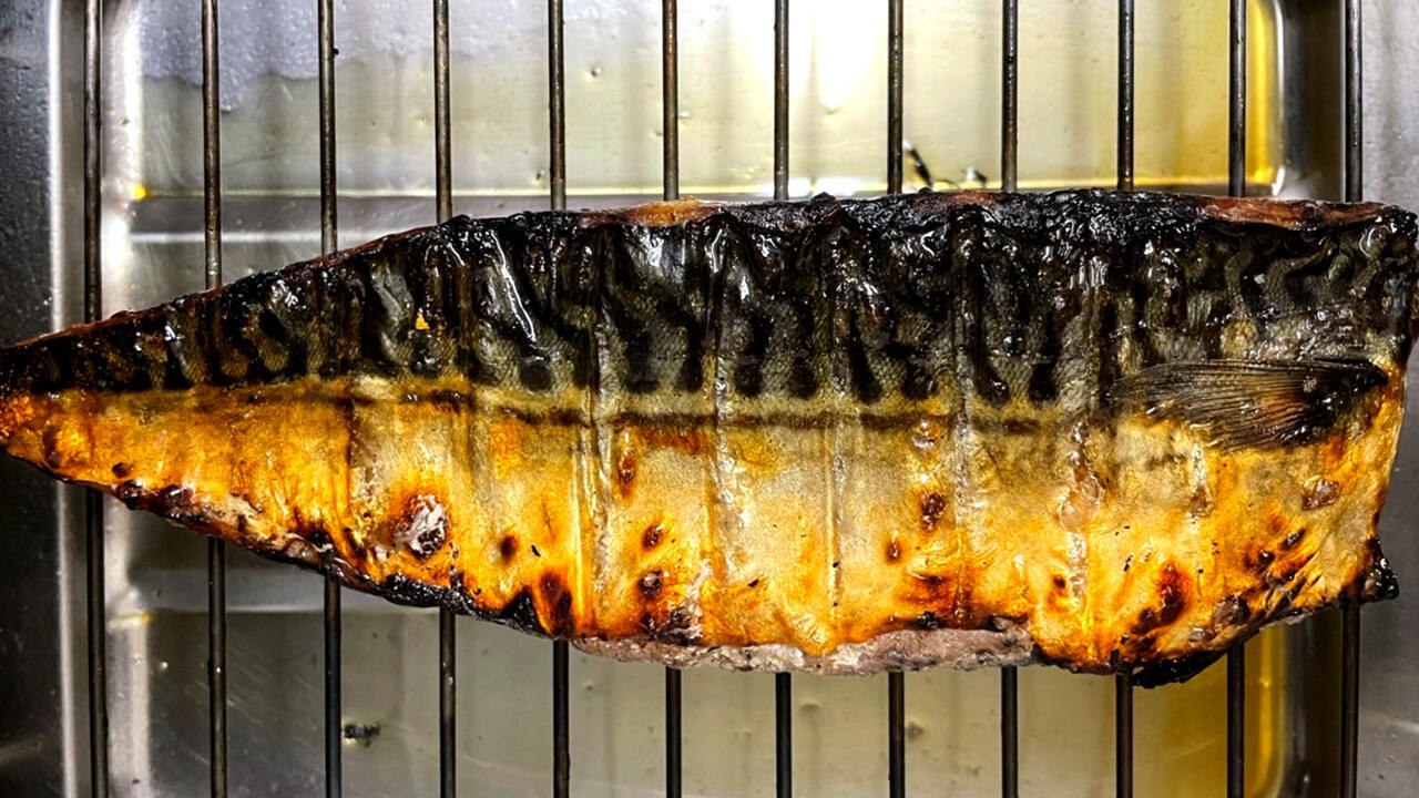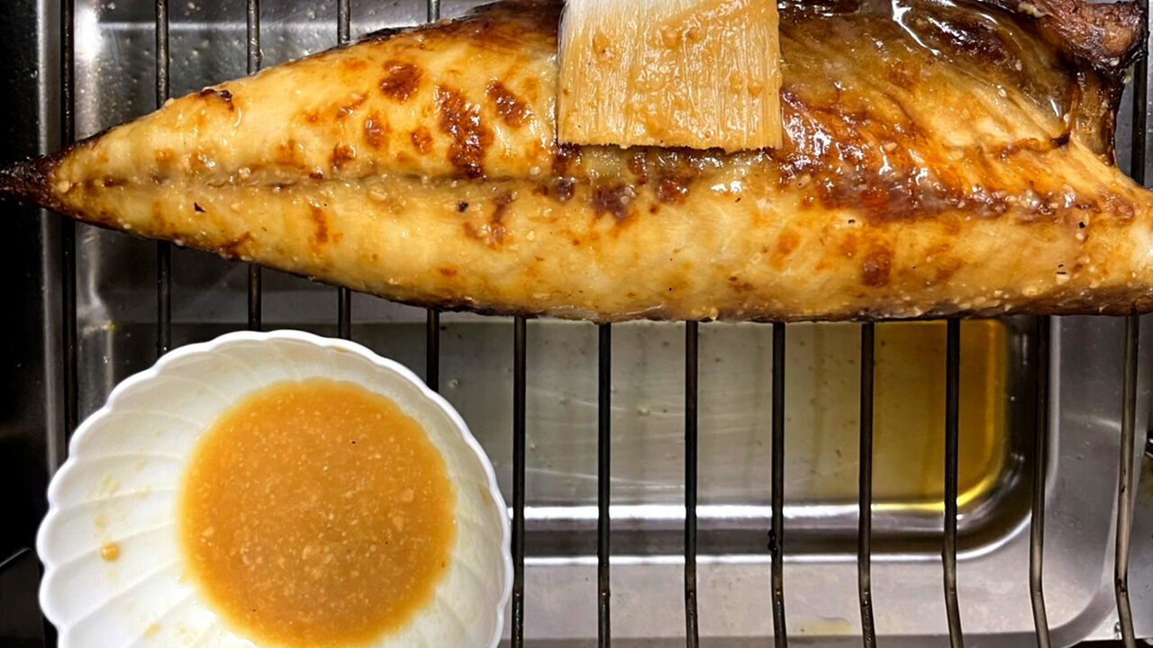 ②グリルで鯖を焼き、焼きあがる前に、酒で解いた味噌を刷毛で塗って香ばしく仕上げる