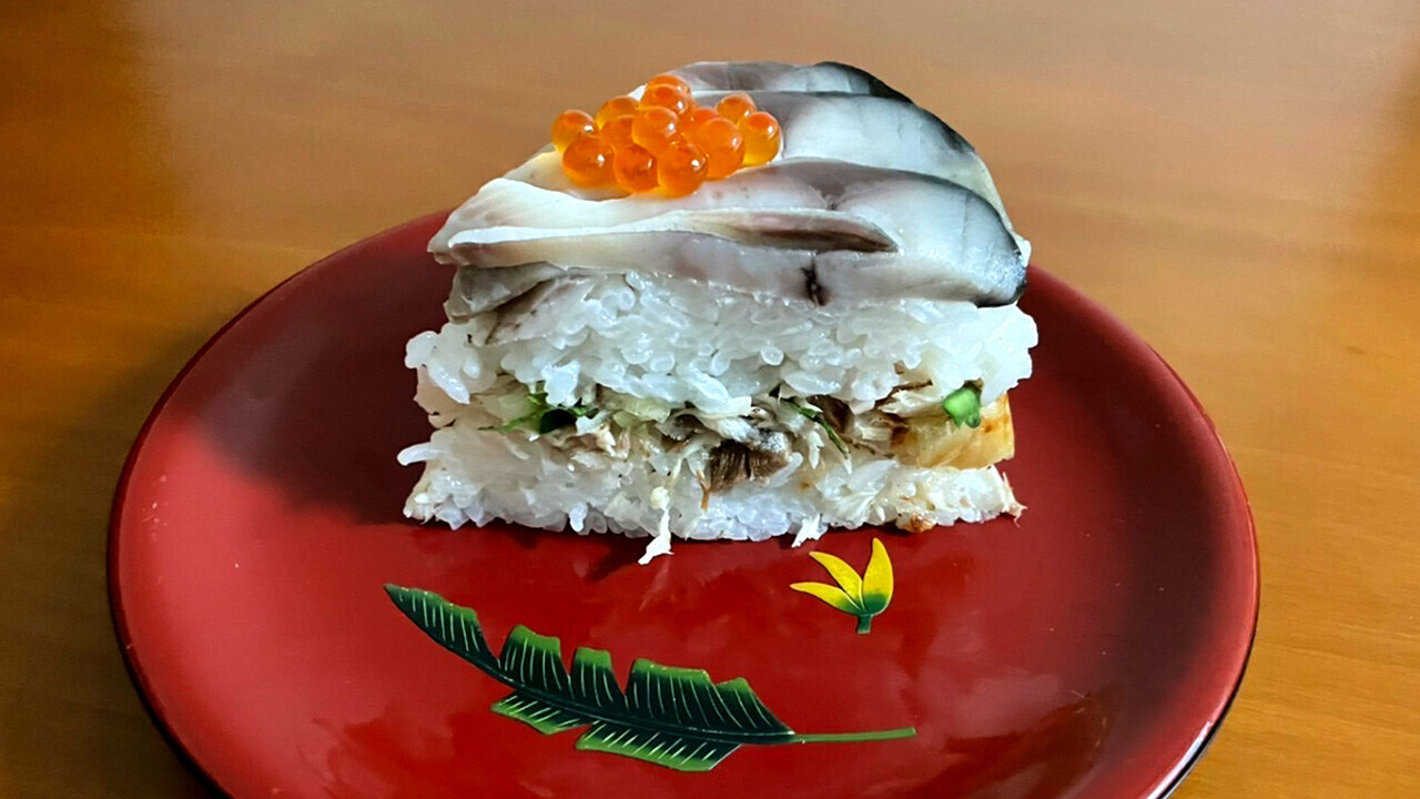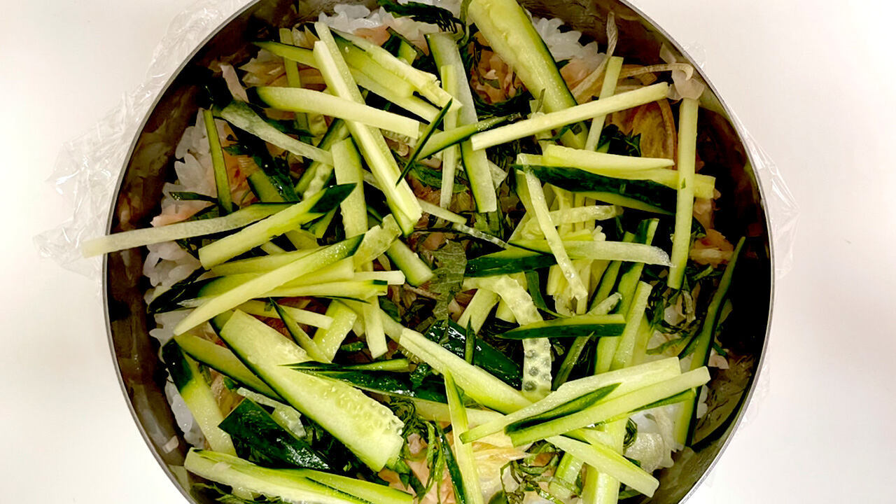 ⑦ そのうえに酢飯を1/3程度入れて平らにし、ガリ、大葉、きゅうり、みょうがを重ねて、ほぐした焼きサバを満遍なく敷き詰める