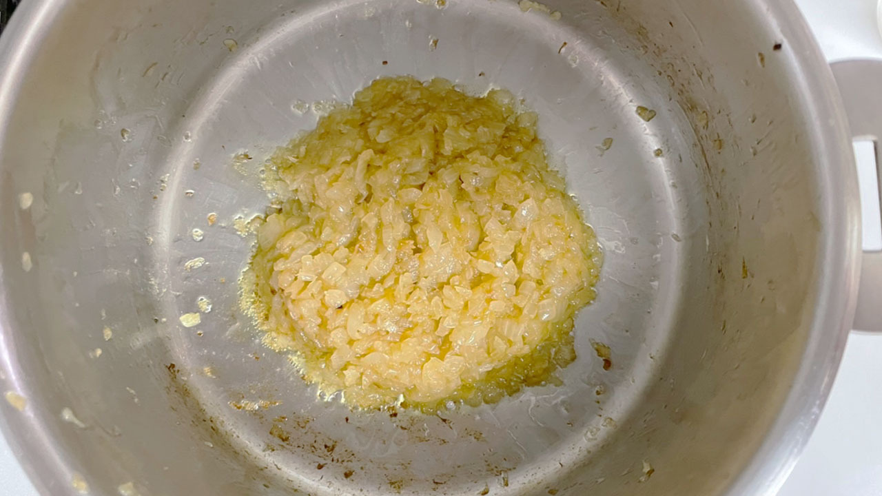 ③ 鍋にサラダオイルをいれ、みじん切りにした玉ねぎを弱火で飴色になるまで炒める。