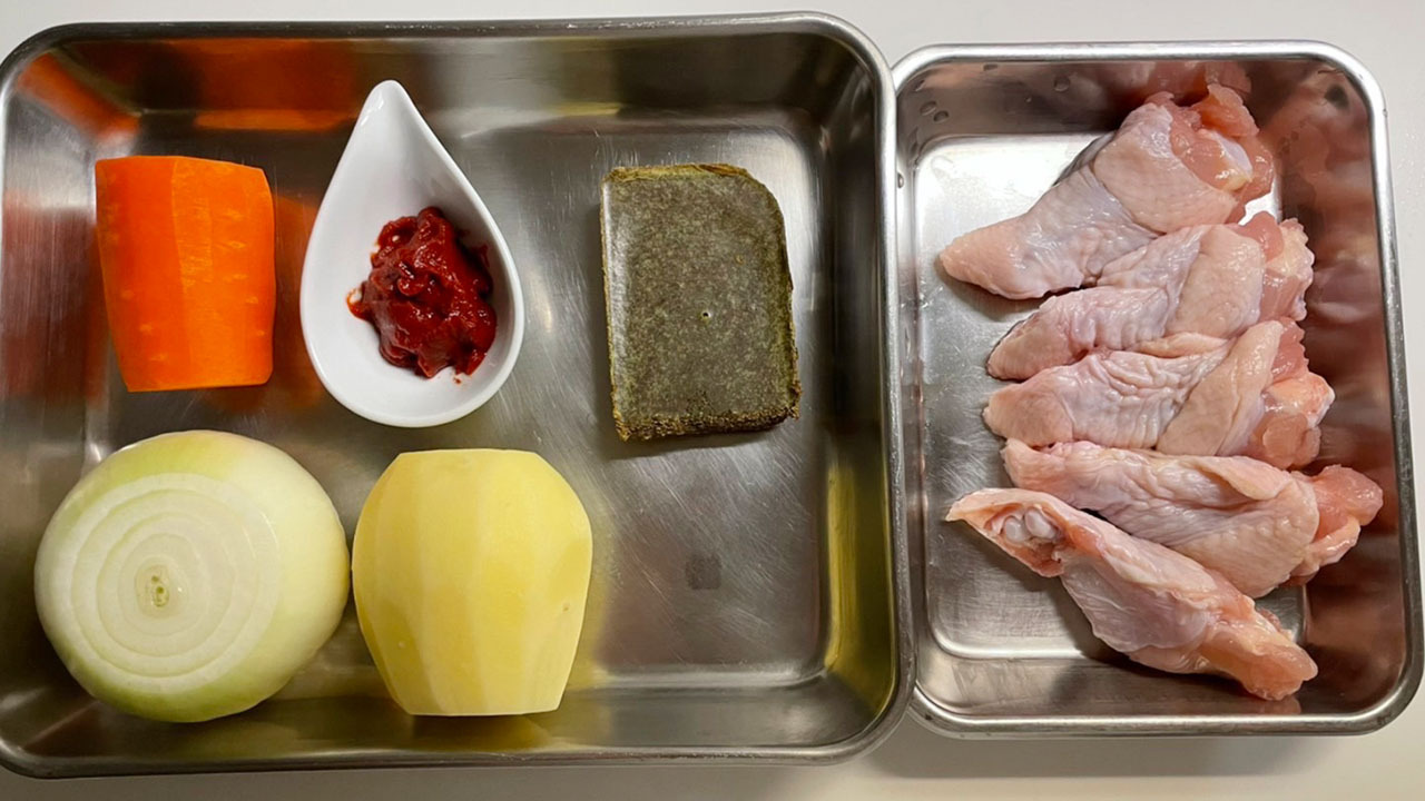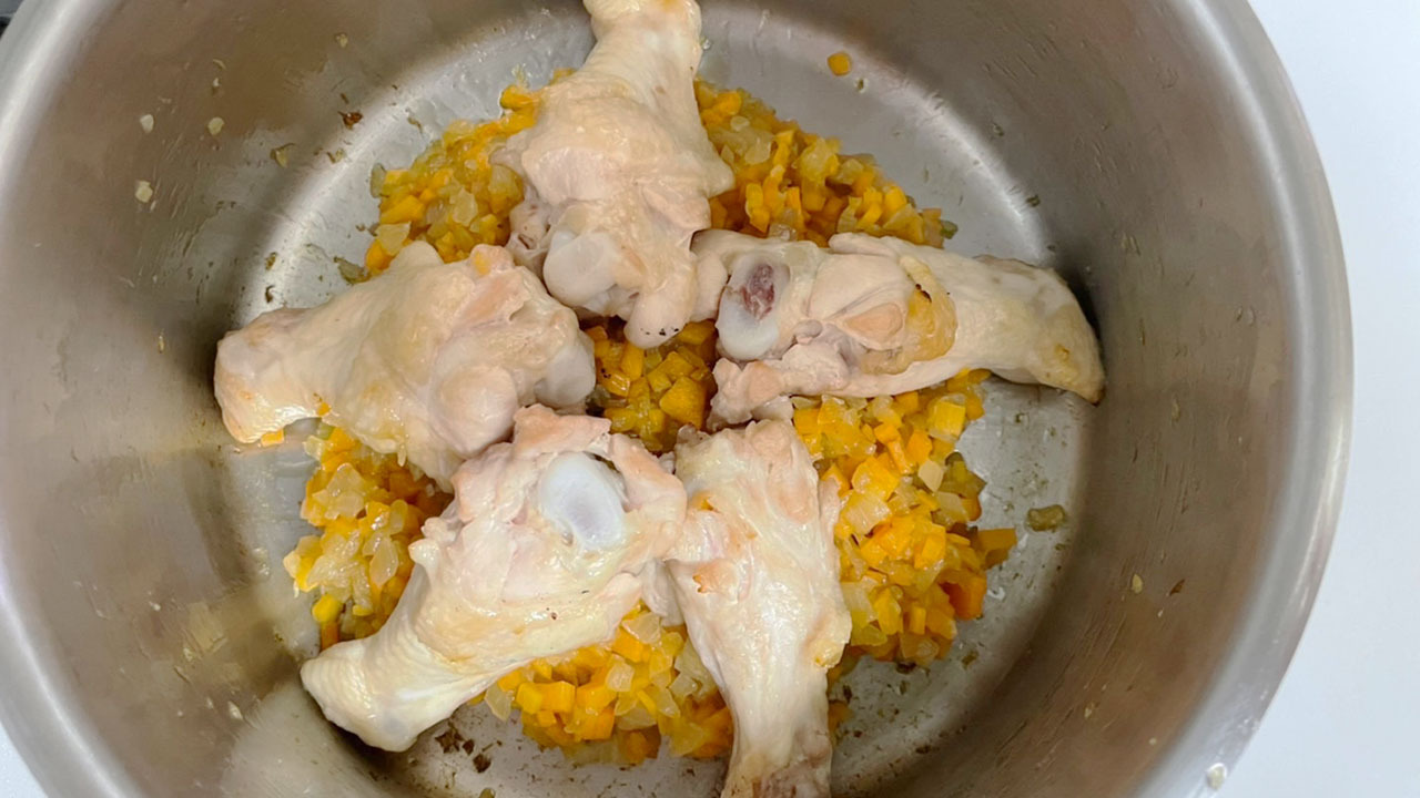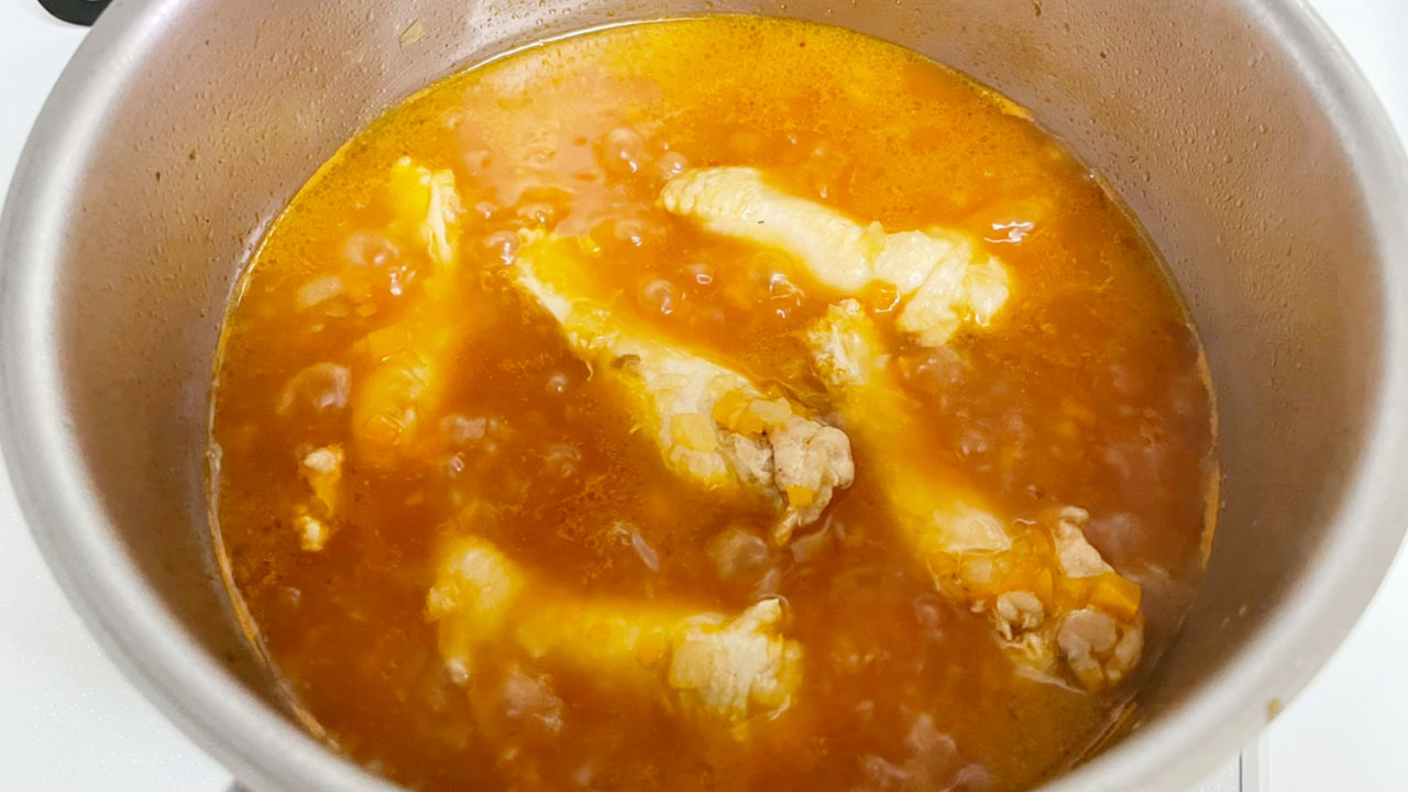 ⑤ 焼いた鶏肉とトマトペースト、水を入れ、20分ほど弱火で煮込む。