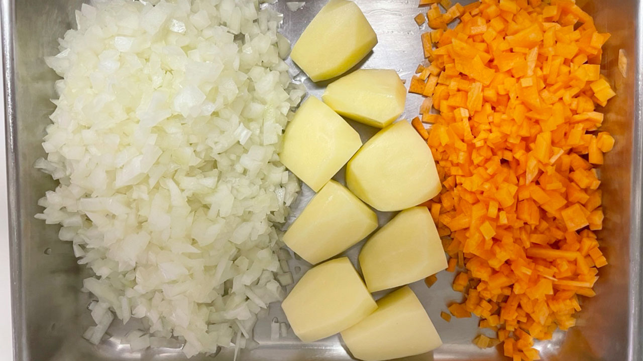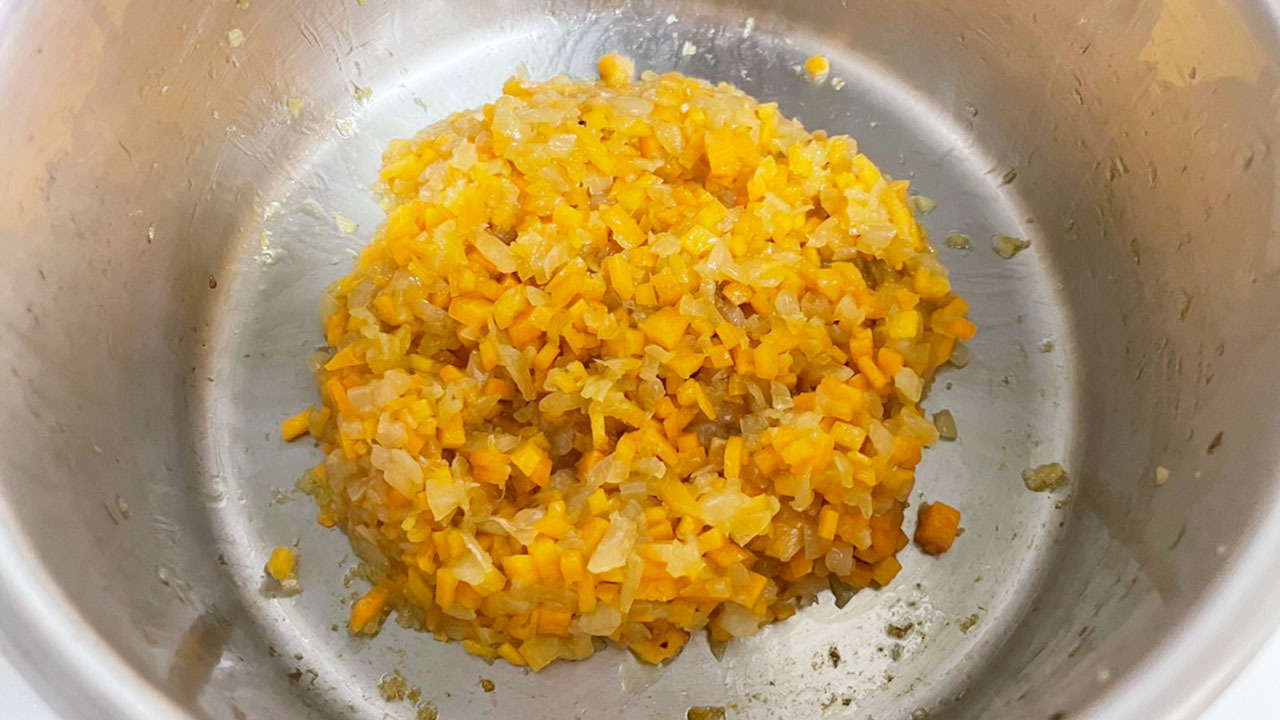 ④ みじんぎりにした人参を加え、さらに5分ほど炒める。