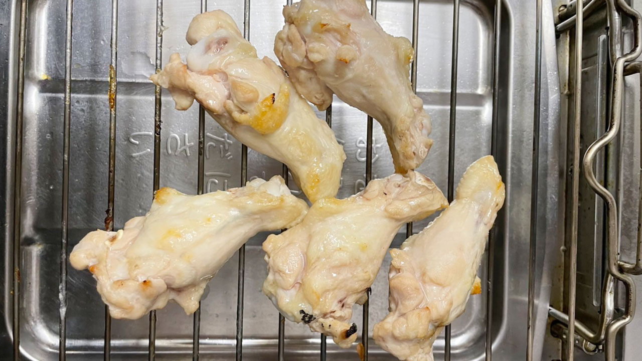 ② 鶏肉をペーパーナプキン等で拭き、グリルで全体を焦げない程度に焼く。