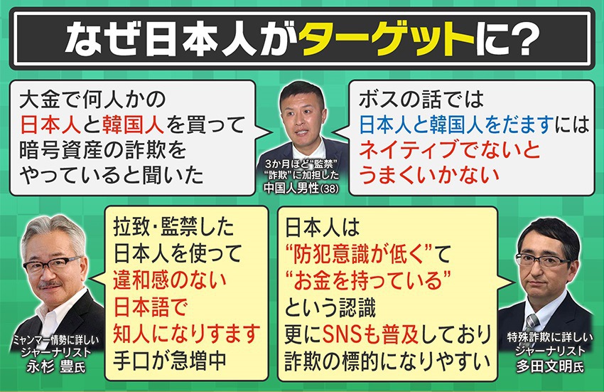 中国人男性(38)によると、「大金で何人かの日本人と韓国人を買って、暗号資産の詐欺をやっていると聞いた。ボスの話では、日本人と韓国人を騙すには、ネイティブでないとうまくいかない」ということです。