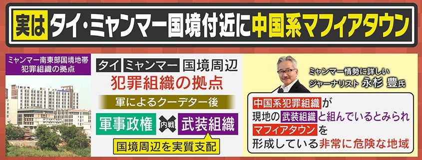 ミャンマー情勢に詳しいジャーナリスト・永杉豊氏は、「中国系犯罪組織が現地の武装組織と組んでいるとみられ、マフィアタウンを形成している非常に危険な地域」だと話しています。