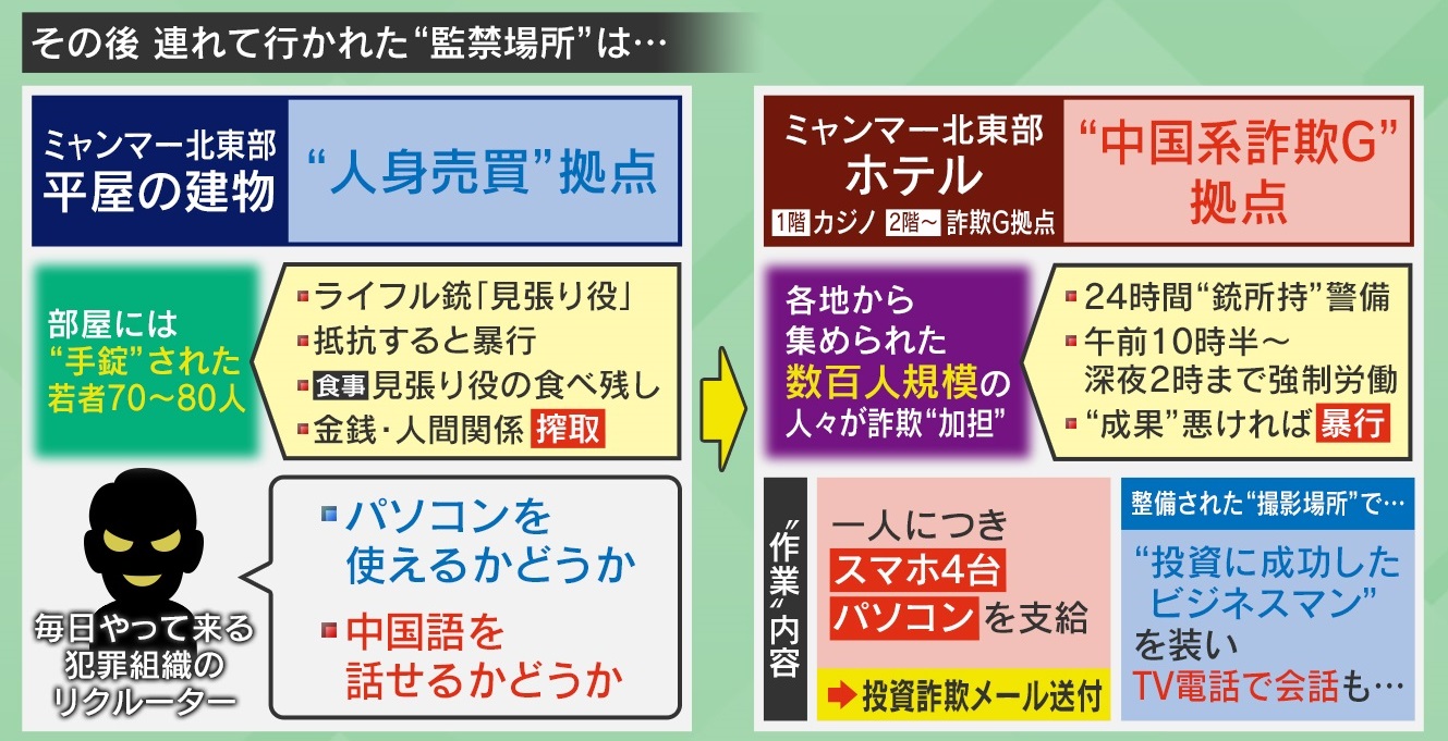 その後、連れて行かれた“監禁場所”はミャンマー北東部の平屋の建物で、人身売買の拠点でした。部屋には手錠された若者70~80人がいて、ライフル銃を持った見張り役がいました。抵抗すると暴行を受け、食事は見張り役の食べ残しのみ、金銭・人間関係は搾取されたということです。そして、毎日やって来る犯罪組織のリクルーターに「パソコンを使えるかどうか」「中国を話せるかどうか」を聞かれ、“品定め”されたといいます。