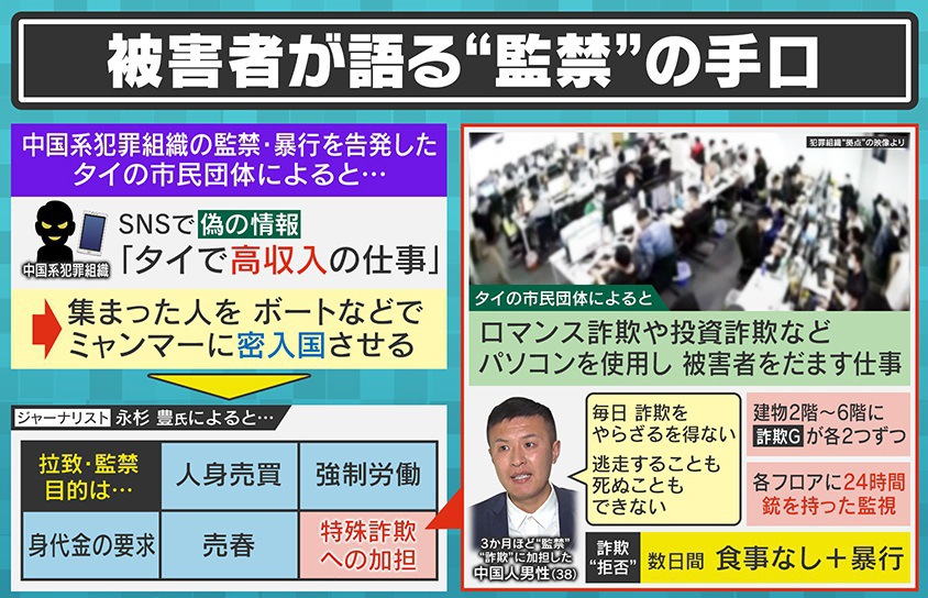 中国系犯罪組織の監禁・暴行を告発したタイの市民団体によると、中国系犯罪組織はSNSで「タイで高収入の仕事」などと偽の情報を出し、集まった人たちをボートなどでミャンマーに密入国させるといいます。ジャーナリスト・永杉氏によると、拉致・監禁の目的は『人身売買』『強制労働』『身代金の要求』『売春』『特殊詐欺への加担』だということです。