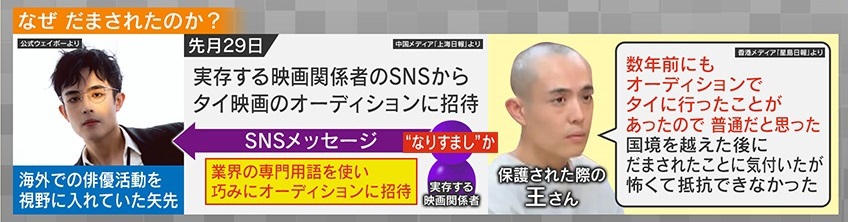 中国メディア『上海日報』によると、王さんは海外での俳優活動を視野に入れていた矢先で、2024年12月29日に、実存する映画関係者のSNSからタイ映画のオーディションに招待されたといいます。ただ、この映画関係者のSNSアカウントは犯罪組織により乗っ取られていた可能性があることが発覚。“なりすまし”は業界の専門用語を使い、巧みに誘ってきたということです。