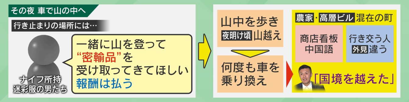 そして、山中を歩き、夜明け頃に山越え。何度も車を乗り換えた先にあったのが、農家や高層ビルが混在した町でした。商店の看板は中国語でしたが、行き交う人の外見がこれまでとは違うことで、この中国人男性(38)は「国境を越えた」と気付いたということです。