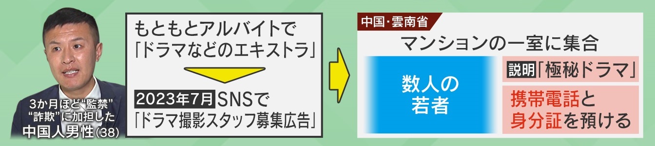 この中国人男性(38)は、もともとアルバイトでドラマのエキストラをしていて、2023年7月にSNSで見た『ドラマ撮影スタッフ募集広告』に応募。中国・雲南省のマンションの一室に集合すると数人の若者がいて、「極秘ドラマ」と説明され、携帯電話と身分証を預けたということです。