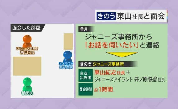 「どうしていったらいいかという部分がメインではありましたが、東山社長がタレントの人たちの意見を直接聞けるように、どうしたらいいかということを試行錯誤しながらやっているという話は聞きました。ただ、すごくドライな言い方になってしまいますが、どれだけ頑張っていると言っても、結局それが可視化されて周りから見えていなければ分からないことなので、それはハッキリと言わせていただきました。透明化ということは必要なのではないかと、意見は伝えました」