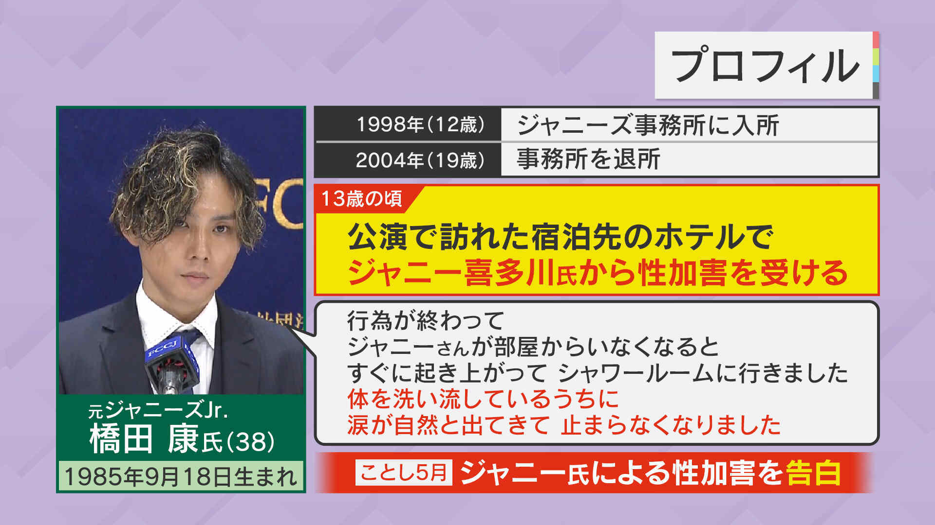 橋田氏は1998年、12歳でジャニーズ事務所に入所し、2004年に19歳で退所しました。13歳の頃、公演で訪れた宿泊先のホテルでジャニー喜多川氏から性加害を受けたといいます。当時の状況について、「行為が終わって、ジャニーさんが部屋からいなくなると、すぐに起き上がって、シャワールームに行きました。体を洗い流しているうちに、涙が自然と出てきて、止まらなくなりました」と振り返っています。そして2023年5月、ジャニー氏による性加害を告白しました。