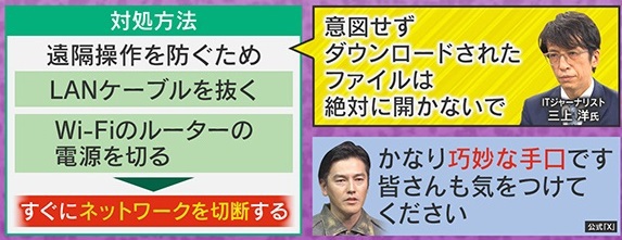 ITジャーナリスト・三上洋氏は、「意図せずダウンロードされたファイルは絶対に開かないで」と警鐘を鳴らしています。要さんも、「かなり巧妙な手口です。皆さんも気を付けてください」と注意喚起しています。
