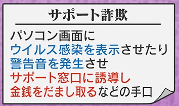 要さんも騙されたという『サポート詐欺』は、パソコン画面にウイルス感染を表示させたり警告音を発生させ、サポート窓口に誘導し、金銭を騙し取るなどの手口です。