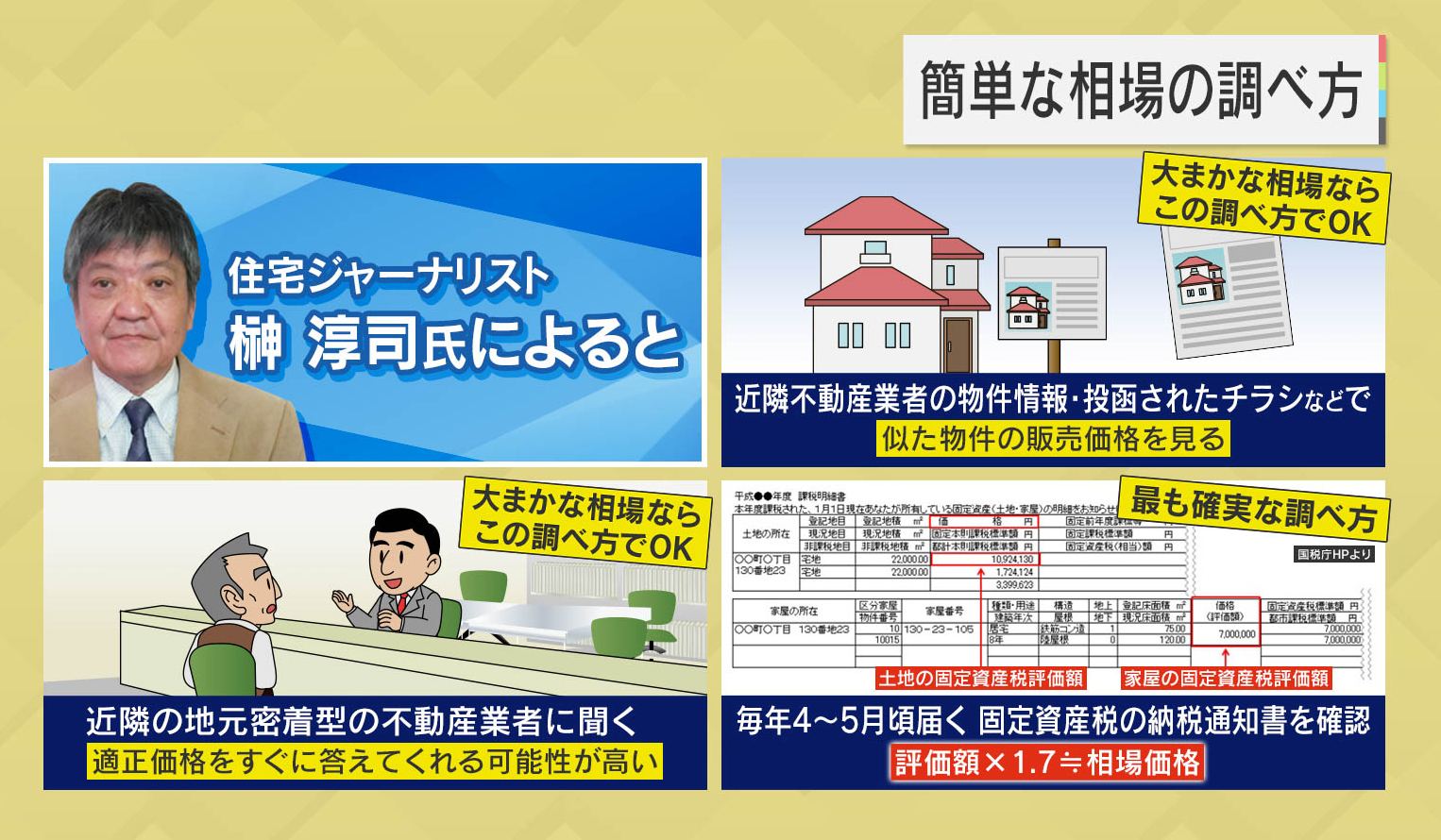 さらに、最も確実な調べ方として、持ち家を持っている場合は、毎年4月から5月に送られてくる、“固定資産税の納税通知書”に書かれている、土地の評価額と家屋の評価額を足して1.7をかけると、相場価格になるということです。(評価額×1.7≒相場価格)