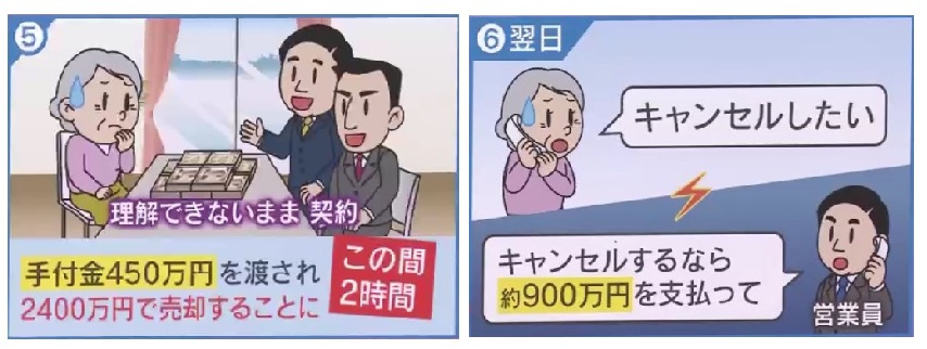 営業員は、「住み替えの物件を紹介するので、心配はいらない」と、勝手に話を進め、書面に押印するように要求。その後、手付金450万円を渡され、たった2時間で、家を2400万円で売却することに応じてしまいます。そして、契約の翌日、Dさんは「キャンセルしたい」と言いましたが、営業員から「キャンセルするなら900万円を支払って」と言われたといいます。