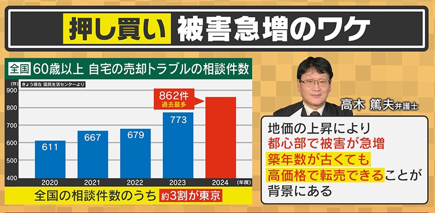 全国の自宅売却トラブルの相談件数が、近年伸びていて、2024年は862件と過去最多でした。特に東京での被害は、全体の約3割だといいます。高木弁護士によると、『押し買い』の被害が急増している理由は「地価の上昇によって、都心部で被害が急増。築年数が古くても高価格で転売できることが背景にある」と話しています。