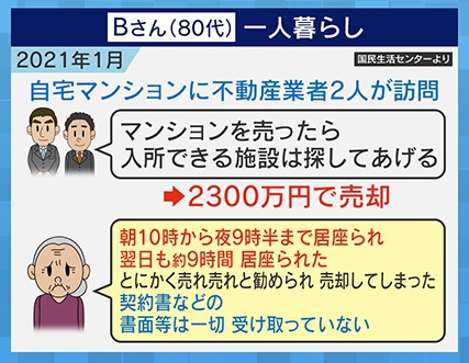 続いてBさん(80代)1人暮らしの女性の例です。2021年1月、自宅マンションに不動産業者2人が訪問し、「マンションを売ったら、入所できる施設は探してあげる」と言われ、2300万円で売却しました。