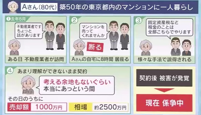 まずは80代の女性、Aさんの例です。築50年の東京都内のマンションに1人暮らしでした。2024年8月、2人の不動産業者の男性が訪問してきました。男性2人はAさんの自宅に8時間居座り、「マンションを売ってくれませんか」と話しますが、この時、Aさんは断りました。