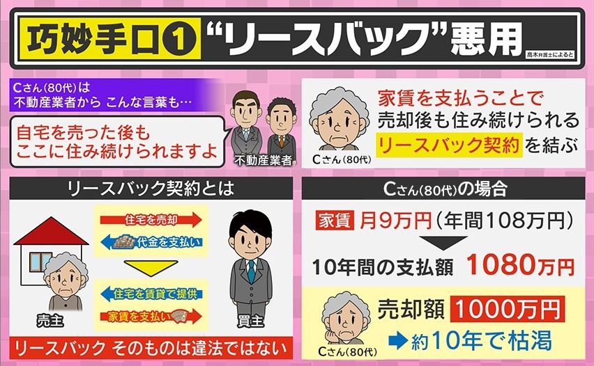 Aさん(80代)の場合、家賃は月9万円で、お得であるかのように言いくるめられ、家を売ったところ、売却額が1000万円でしたが、相場は2500万円の物件だったということです。