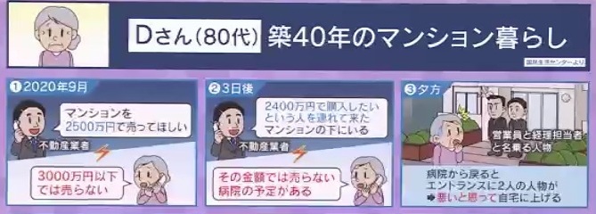 築40年のマンションに住んでいた80代の女性・Dさんのケースです。ある日突然、不動産業者から「マンションを2500万円で売ってほしい」という電話がありました。しかし、Dさんは「3000万円以下では売りません」と断ります。