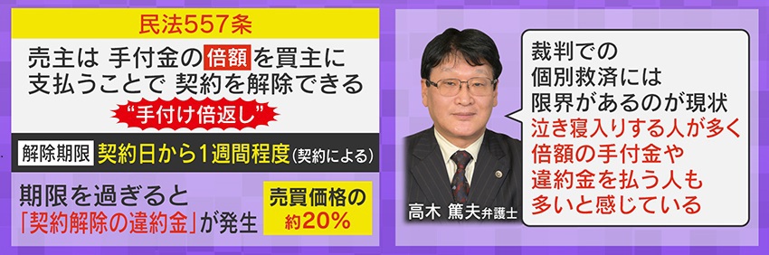 高木弁護士によると「裁判での個別救済には限界があるのが現状。泣き寝入りする人が多く、倍額の手付金や違約金を払う人も多いと感じている」とのことです。