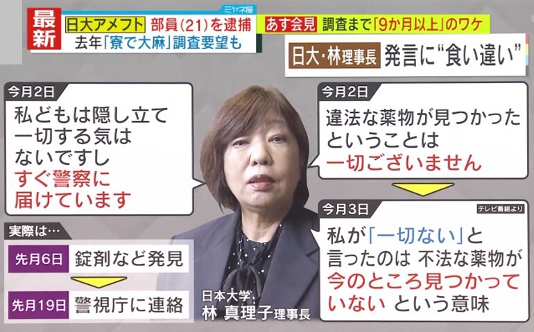 しかし今回、林真理子理事長の発言には“食い違い”が生じています。林理事長は8月2日、「私どもは隠し立て一切する気はないですし、すぐ警察に届けています」と発言しました。ただ実際は、大学側が錠剤などを発見したのが7月6日で、警視庁に連絡したのは19日と、約2週間のタイムラグがあります。また、「違法な薬物が見つかったということは、一切ございません」と発言していましたが、その翌日である8月3日にはテレビ番組の取材に対し、「私が『一切ない』と言ったのは、不法な薬物が今のところ見つかっていないという意味です」と、発言を訂正しました。