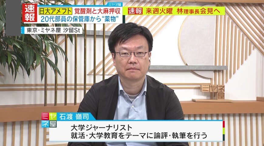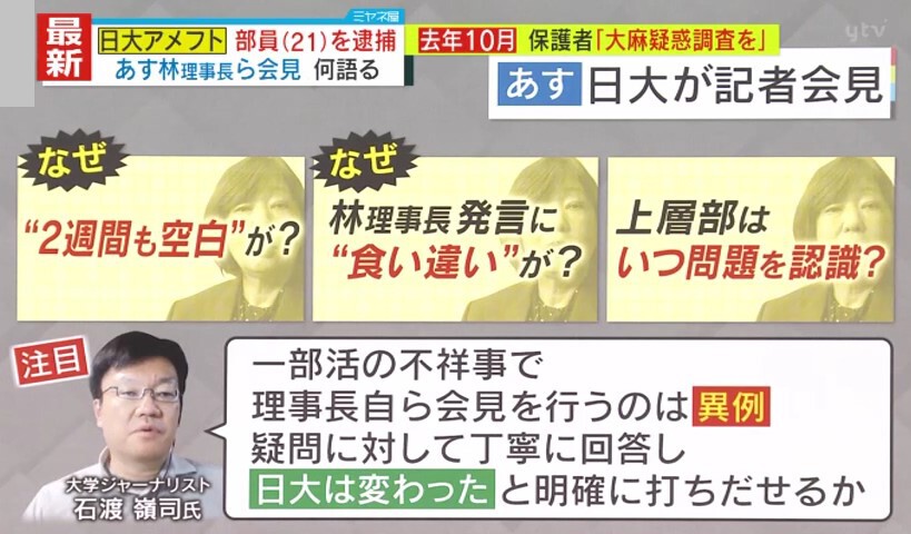 「はい、真面目に取り組んできた部員たちにしてみれば、裏切られた気持ちだと思います。ただし、これが個人の犯罪なのか、他の部員も含めての組織的な話なのかというのは、今後の解明が待たれます。8日には林理事長が会見予定ですが、誰が何を知っていたのか、どこで情報の目詰まりを起こしたのか、なぜ大麻を約2週間も保管してしまったのか、そのあたりの真相を明らかにしてほしいと思います」